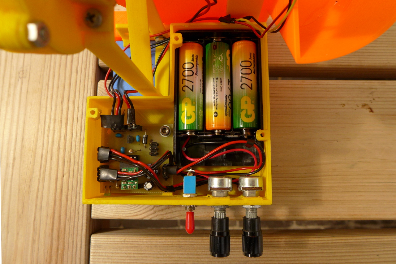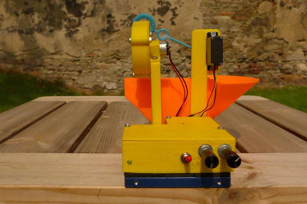 There are two potentiometers mounted to the back side. One can adjust the fan speed which influences the size of bubbles. The second pot controls the delay between blows.