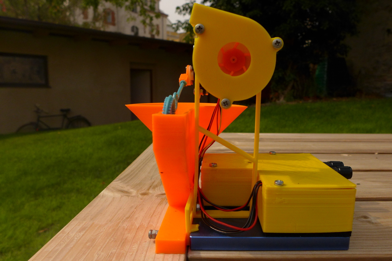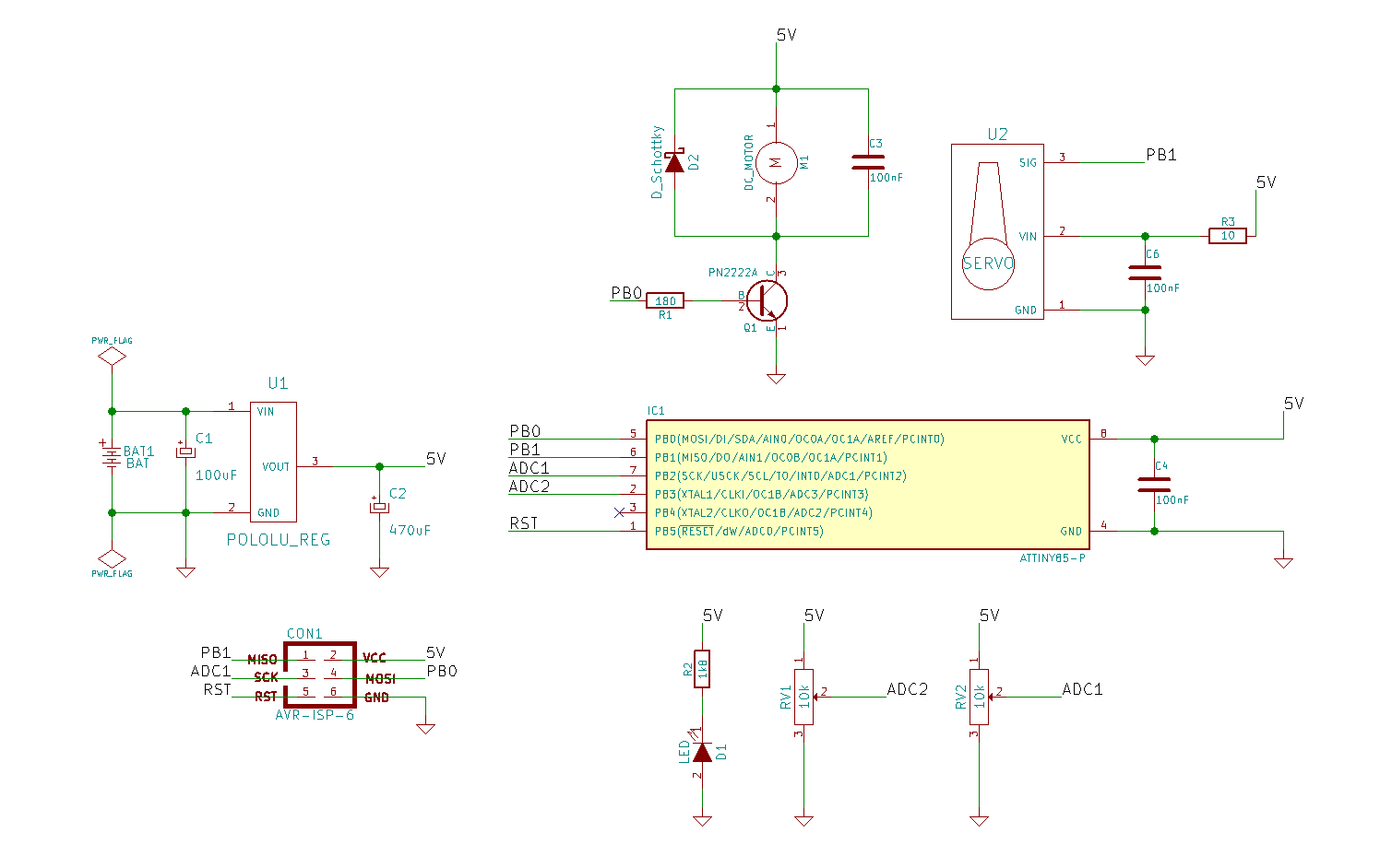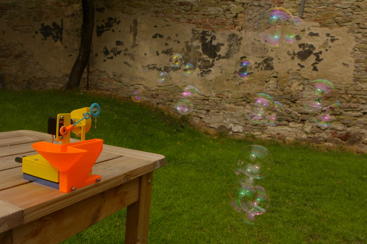 It is controlled by ATTiny85. It uses a microservo to move the stick and a 5V DC motor driven by a 2N2222 which rotates the fan blades. BubbleBot is powered by 3 AA batteries stepped up to 5V and draws ~250mA at a peak.